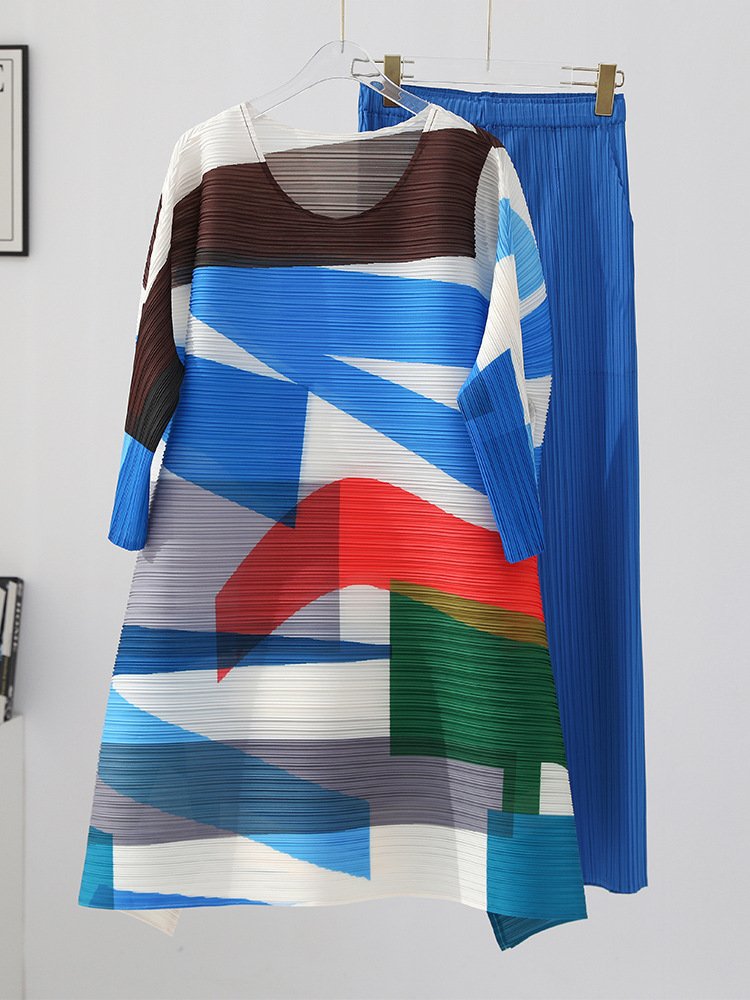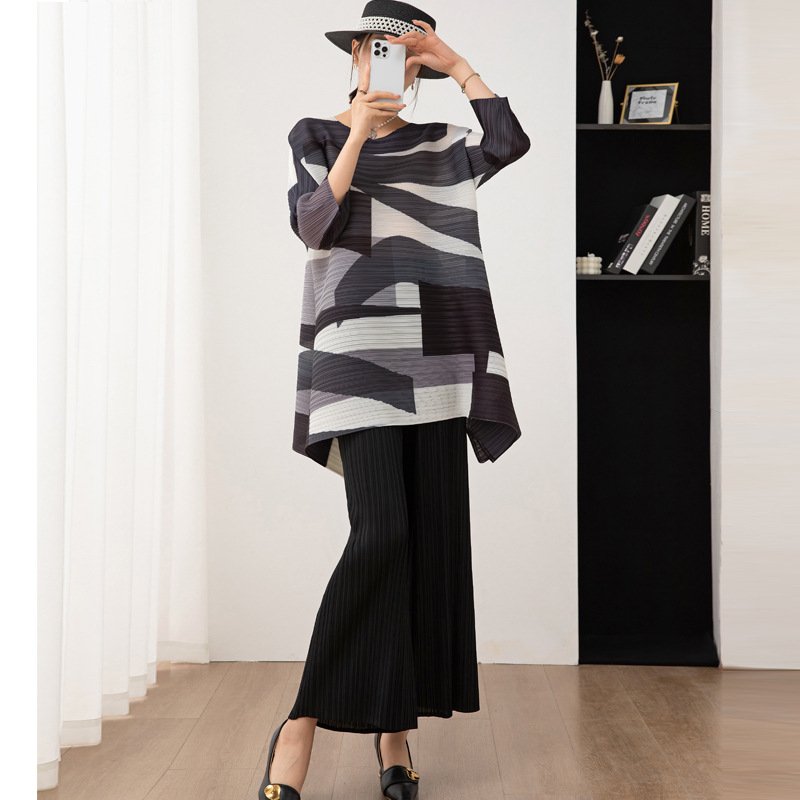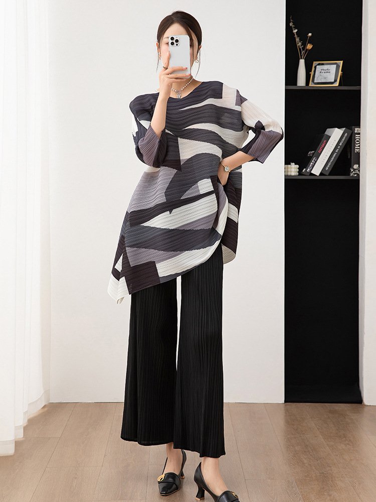Autumn and winter women’s clothing trend set, women’s fashion two-piece set, new printed mid length top, wide leg pants