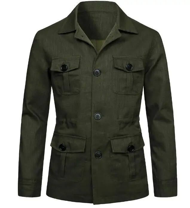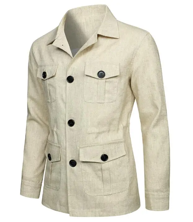 Cotton Linen Cargo Jackets Men Multi Pockets Outdoor Jacket