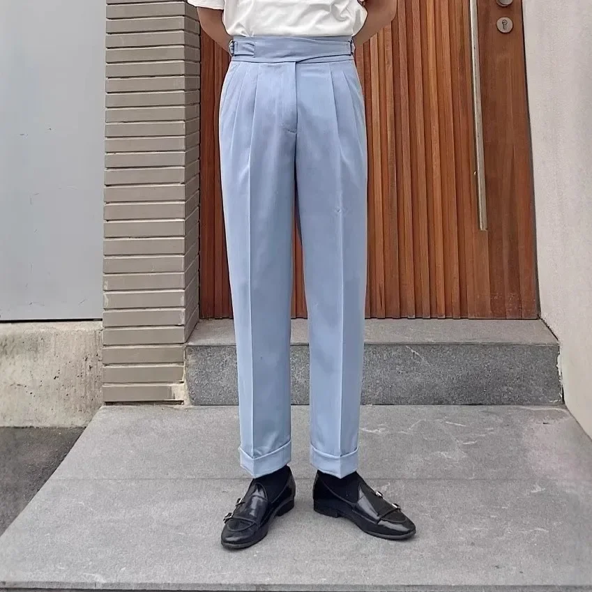 Paris Buckle Men’s Suit Pants High Waist Slim Fit British Style Vintage Business Casual Straight Leg High Rise Long Trousers